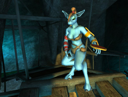 Das Spiel läuft in Echtzeit und basiert auf der Triniti-Vision3d-Engine. Das Bild zeigt die fremdartige Hauptdarstellerin, für deren Beine ein sehr unorthodoxes Rig nötig war.